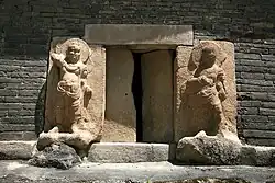 Although once hollow, the collapsed stories of the pagoda have filled the center of pagoda with debris. An excavation and partial restoration in 1915 by the Japanese uncovered a sarira, or relic box, of the cremated remains of a priest hidden in between the second and third stories.[1][2] Precious artifacts such as gold and stone ornaments, coins, scissors, and a needle were also found in the pagoda which indicated that a woman of royal blood, perhaps even Queen Seondeok herself, had once owned the objects.[1] Each side of the pagoda has what may have once been doors into the interior of the pagoda. Two figures guard each doorway and are known as Geumgan-yeoksa (literally "Mighty Diamond Men" from Skt "vajra-yakṣa") or Inwangsang, guardians of the Buddhist canon.[1][2] Each corner of the one-step platform upon which the pagoda rests holds a guardian lion statue. Granite lotus blossoms also adorn the pagoda.[2]