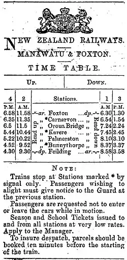 - ^ "Railway Service. FEILDING STAR". paperspast.natlib.govt.nz. 4 August 1906. Retrieved 11 March 2021.