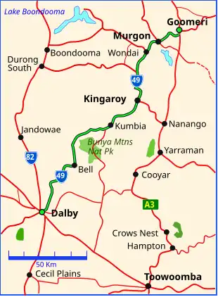 It is a state-controlled regional road (numbers 45A (Dalby to Kingaroy) and 45B (Kingaroy to Goomeri)).[2][3][4]