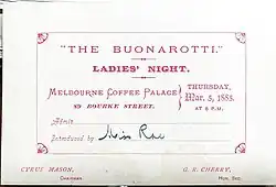 17. ^ The Buonarotti Conversazione. Tuesday, May 4th, 1886. Programme. Mason Firth & McCutcheon. Printers, Melbourne 1886. Private Collection