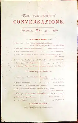 "The Buonarotti" Conversazione Programme for Tuesday, May 4, 1886, offered;[17]