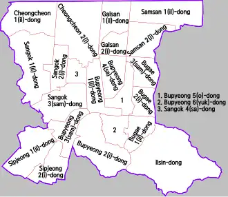 The administrative divisions of Bupyeong District consist of 22 dongs. Bupyeong District is approximately 3.09% of the area of Incheon with an area of 31.98 km2.