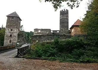 The oldest preserved part of the hilltop castle is located in the western part of the complex, directly at the five-storey keep on a hill directly on the steep slope. The mighty keep, built on an isolated rock block, has a bearing-like, uniform quarry stone masonry, which indicates that it was built in the 13th century. The western side of the tower has a semicircular and the eastern side an irregular polygonal ground plan. The original entrance was via the first floor at a height of about eight metres. It has partially broken-out Romanesque jambs made of ashlar. The door on the ground floor was only broken out in more recent times. Originally, the ground floor could only be reached through a hole in the vault. Both the ground floor and the first floor have vaulted ceilings. From the first floor, a staircase in the wall thickness leads to the first floor. It can be seen from the wall offsets that the second and third upper floors used to have a beamed ceiling. All floors are lit by light slits. The third floor probably had a balcony. This is indicated by a doorway facing south. The keep has been renovated and can be climbed to a platform. The uppermost platform is surrounded by battlements and also forms the fourth upper storey. On the wall of the keep there is an inscription with the date 1623, which refers to the extension by the noble family of Herberstein. The wall remains to the north and south of the keep have mostly the same masonry as the keep.