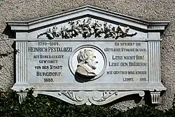 During the 1798 French invasion and the creation of the Helvetic Republic, the last Bernese administrator, Rudolf of Erlach, worried that the castle would be plundered or burned. He moved all the government records to a nearby church. The castle was spared and the documents remained safe. Under the Helvetic Republic, the castle served, first, as a military hospital. Then, in 1800, the famous educator Heinrich Pestalozzi established a school in the castle.[6] Only four years later, the cantonal administration took over the castle and converted it into government offices. In 1886 the castle was renovated and the Castle Museum opened in the so-called Knight's Hall.[3]