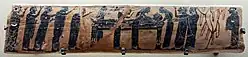 The group’s name is derived from Thomas Burgon (1787–1858), who supervised the 1813 excavations in Athens, during which the Panathenaic prize amphora London B 160, now on display in the British Museum, was discovered.[1] The group, recognized by modern scholarship on the basis of stylistic similarities to numerous vases, is particularly important for having produced the earliest known Panathenaic amphora, the Burgon vase (the group’s name vase). As usual for such amphorae, the front image depicts the goddess Athena and the back shows a two-horse chariot during a race. Another famous piece is a Siana cup with a sowing scene, perhaps of mythological relevance. The Painter of London B 76 is stylistically closely related to the Burgon Group.