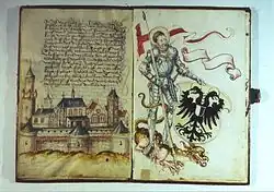 Members of the Fraternitas equestris S. Georgii were required to wear a silver or gold-plated necklace featuring the image of St. George on specific days. St. George was a patron saint of the castle, and the medieval castle church, which was demolished in 1783, was dedicated to him.[71] The St. Georgsbrunnen (St. George's Fountain) in the castle, adorned with coats of arms of the burgrave, the two master builders, the castle, and the ten regimental burgomans, highlighted the castle's governance.[72][73]