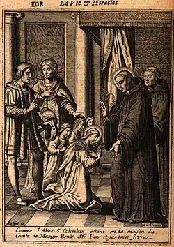Then Columban went to the city of Meaux. There he was received with great joy by a nobleman Hagneric (Chagneric, father of Burgundofara), who was a friend of Theudebert [King Theudebert II], a wise man, and a counsellor grateful to the king, and was fortified by nobility and wisdom. ... Columban blessed his house and consecrated to the Lord his daughter Burgundofara, who was still a child, and of whom we shall speak later.[2][3]