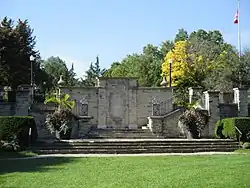 This park is between Blythwood Ravine Park and Yonge Street. It contains the tennis courts of the Lawrence Park Tennis Club and the fields of the Lawrence Park Lawn Bowling and Croquet Club. The main attraction of the park is the song The Maple Leaf Forever, a patriotic song about Canada,[10] by Alexander Muir, printed on a stone wall with stairs connected to the fields and gardens of the park. The park was originally located on the west side of Yonge Street across from the Mount Pleasant Cemetery to celebrate the Toronto centennial celebrations. To build the Yonge Subway the TTC paid over $100,000 to move the park, including the stone wall, to its current location in Lawrence Park.[11][12][13]