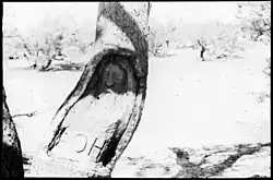 Called in 1911 by the Sydney Mail "William Brahe's Tree", an accompanying photograph showed a "DIG" inscription on the right-hand branching trunk partly overgrown with bark, obscuring the "D". Another blaze on the left-branching trunk showed some indecipherable letters and/or numerals. Surviving remnants of Brahe's stockade also are visible in the photograph. In 1928 the Royal Geographical Society of South Australia referred to the tree as better known as the "Depot Tree", alluding to its function of marking a major stopping and storage place for the expedition. Frank Clune's 1937 book Dig has been credited with changing the tree's popular, and still-current name, to the "Dig Tree".[1]