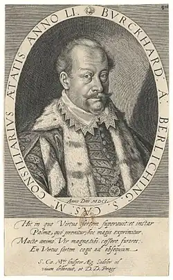 Burkhard von Berlichingen (c.1550–1623) was an imperial councillor at the court of Holy Roman Emperor Rudolph II. He became court councillor of Württemberg in 1579, chancery councillor in 1586, and in 1588 was sent to the imperial court in Prague, where he became imperial councillor.[1] In 1597 he built the north wing of Filseck Castle.
