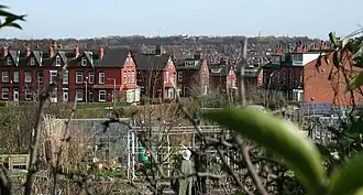 ![]() Looking east over Burley Model Allotments towards Leeds University | |