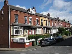 Burley grew from a village in the late Industrial Revolution, and there are several streets including the word 'village' including The Village Street. The area from The Village Street in the west to the railway line in the east, and north of Burley Road forms the Village Conservation Area.[2] Parts of the original village can still be seen at the junction of Burley Road and Haddon Road, and around Burley Lodge. Most houses constructed in Burley were of red-brick, but were generally smaller and largely back-to-backs. Industrial and commercial buildings were also largely brick-built. There are some larger stone-built buildings on Kirkstall Road such as the ornate Cardigan Arms public house—although this largely pre-dates most of the buildings in the area—which at the time of its construction only Burley Village existed, with the Arms somewhat outside.