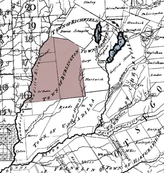 Early settlers came from New England. Township named after Burlington, New Jersey by William Cooper and Andrew Craig, early land patent owners. At an early time the Butternut Creek was dubbed "Burlington Creek" as well but the name did not stick.
