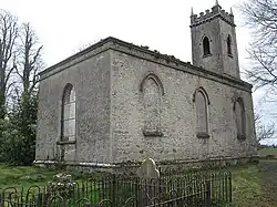 The nearby Church of Ireland (Anglican) church was built c. 1810.[12] It has been disused since its closure in the mid-20th century.[12] The adjoining cemetery contains grave markers dating from the early 18th to the mid-20th century.[12]