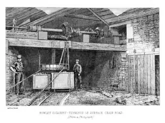 Coal was exploited in the 13th century at Trawden near Colne where receipts are mentioned in a rent roll from 1295. Coal was also bought at Cliviger.[9] The first coals were extracted at the outcrops before shaft and adit mining were adopted. The coal industry grew in the 16th and 17th centuries, developing from manorial tenants who dug coal for their own use into fixed term leases in return for rent. Coal was mined all around Burnley, mostly from shafts. By 1800, more than a dozen pits had been sunk in central Burnley.[10]