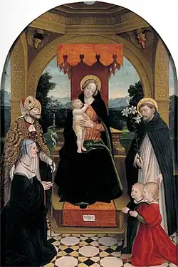 The Buronzo Altarpiece is a 1514 tempera on panel painting by Gerolamo Giovenone, now in the Galleria Sabauda in Turin, to which it was given in 1836, only a few years after the gallery opened.[1] It shows the Madonna and Child with Saints Abundius and Dominic presenting the work's commissioner Ludovica Buronzo and her sons Pietro and Gerolamo. It is signed and dated by the artist on a small scroll on the base of the throne. It was produced for the Sant'Abbondio chapel in San Paolo church in Vercelli, later passing onto the art market.[2]