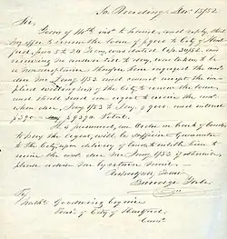 Over time, he made a fortune in his line of business.[2] He tried his way into politics, but ran unsuccessfully for a seat in the Massachusetts House of Representatives.[2] He became Wakefield's town treasurer and justice of the peace for number of years.[12][3][2] He was also town moderator.[13][14] Starting in 1825, Yale opened a tavern named the Burrage Yale Inn, next to his factories in Wakefield, and on March 16, 1827, he became the first postmaster of South Reading, Massachusetts, and the first postmaster to be recognized in Washington, D. C..[15][3] He kept the office for about 3 years until he let his brother, Eli. A. Yale, a partner in his ventures, take the office.[3]