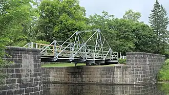 There is a lock on the canal to bypass rapids here, the Burritts Rapids Bridge which crosses the canal and a stationary bridge which crosses the river.