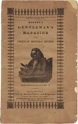 The magazine's most famous contributor and one-time editor was Edgar Allan Poe. Poe approached Burton to offer his services in May 1839.[3] The June issue of that year included the notice that its owner had "made arrangements with Edgar A. Poe, Esq., late Editor of the Southern Literary Messenger, to devote his abilities and experience to a portion of the Editorial duties of the Gentlemen's Magazine". Poe agreed to provide about 11 pages of original material per month and his name was added next to Burton's.[4] His role included editing articles and proofreading as well as original contributions like critical reviews.[2] Burton offered Poe $10 a week for his services and estimated he would need to dedicate only two hours a day.[5] In Burton's, Poe published now several of his own original tales including "The Man That Was Used Up" (August 1839), "The Fall of the House of Usher" (September 1839), "William Wilson" (October 1839), "Morella" (November 1839), "The Conversation of Eiros and Charmion" (December 1839) and "The Business Man" (February 1840).[2] Disagreements between the two caused Burton to fire Poe in June 1840.