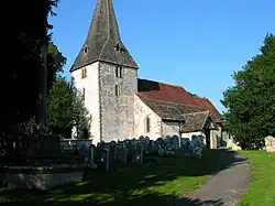 The villages of Bury and nearby West Burton are sited at the foot of the scarp slope of the South Downs, where springs from the chalk strata provided a constant supply of clean water. The Anglican parish church of St. John the Evangelist lies east of the village centre on the west bank of the River Arun. The church is dominated by a 12th Century tower with a cedar-shingled spire.[3] There was formerly a passenger ferry by rowing boat to Amberley on the east bank.[4]