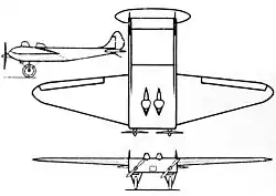 It had a tailskid undercarriage with independently mounted wheels 1.665 m (5 ft 5.6 in) apart.[1] Each wheel was mounted on its own axle, about 700 mm (28 in) long and hinged at its inner end to a vertical strut from the inboard fuselage underside and another, outward leaning one above the axle to the centre-section near its edge. A faired vertical leg with a steel tube core from near the edge supported the outer axle end on a rubber shock absorber. Four cables supplied fore-and-aft rigidity.[1][4]