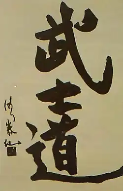 Bushidō (武士道; Japanese pronunciation: [bɯ.ɕiꜜ.doː][1]) is a Samurai moral code concerning samurai attitudes, behavior and lifestyle.[2][3][4] Its origins date back to the Kamakura period, but it was formalized in the Edo period (1603–1868). There are multiple types of bushido which evolved significantly through history.[2][3][5] Contemporary forms of bushido are still used in the social and economic organization of Japan.[2] Bushido is also used as an overarching term for all the codes, practices, philosophies and principles of samurai culture.[6][7][8] It is loosely analogous to the European concept of chivalry, but with some major differences.[9][6]