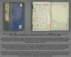 Another early use of the written term is in the Kōyō Gunkan in 1616 by Kōsaka Masanobu. In 1685, the ukiyo-e book Kokon Bushidō ezukushi (古今武士道絵つくし, "Images of Bushidō Through the Ages") by artist Hishikawa Moronobu included the term and artwork of samurai with simple descriptions meant for children.[2] In 1642, the Kashoki (可笑記, "Amusing Notes") was written by samurai Saito Chikamori and included moral precepts which explained the theoretical aspects of bushido.[2][25] It was written with accessible kana and intended for commoners, not warriors.[2] It was very popular, demonstrating that the idea of bushido had spread among the population.[2] The Kashoki shows that moral values were present in bushido by 1642.[2]