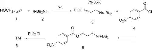 The addition of metallic sodium to a mixture of allyl alcohol (1) and dibutylamine (2)[2] gives the conjugate addition product 3-dibutylamino-1-propanol (3). Reaction of this intermediate with p-nitrobenzoyl chloride (4) gives the ester 5. A Béchamp reduction of the nitro group completes the synthesis of butacaine (6).[3][4][5][6][7][8]