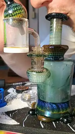 Smoking or vaporizing hash oil is known colloquially as "dabbing",[6] from the English verb to daub (Dutch dabben, French dauber), "to smear with something adhesive".[19] Dabbing devices include special kinds of water pipes ("dab rigs"), vaporizers and vape pens similar in design to electronic cigarettes.[6] Oil rigs include a glass water pipe and a quartz bucket which is often covered with a glass bubble or directional cap to direct the airflow and disperse the oil amongst the hot areas of the quartz "nail" (A nail is also referred to as a banger).[6] The pipe is often heated with a butane blowtorch rather than a cigarette lighter.[6]