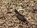 This slim and small hawk is easily identified by its white iris and the white throat and dark mesial stripe. A white spot is sometimes visible on the back of the head. When perched, the wing tip nearly reaches the tip of the tail. The ceres are distinctly yellow and the head is dark with the underside of the body darkly barred. In flight, the narrow wings appear rounded with black tips to the feathers and the wing lining appears dark. The upper wing in flight shows a pale bar over the brown. The rufous tail is barred with a darker subterminal band. Young birds have the iris brownish and the forehead is whitish and a broad supercilium may be present.[2] The only confusion can occur in places where it overlaps with the grey-faced buzzard (Butastur indicus), adults of which have a distinctive white supercilium.[3][4] Fledgelings are reddish brown, unlike most other downy raptor chicks, which tend to be white.[5]