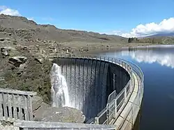 Butchers Dam is a lake 5 kilometres southwest of Alexandra, Central Otago, in the South Island of New Zealand. The lake, on the eastern side of Alexandra-Fruitlands Road of New Zealand State Highway 8, is named for its concrete dam. It used to be an important water supply for Alexandra, but is now mostly used for irrigation purposes. Its construction began in 1935 and was completed in 1937 as a water reservoir for Alexandra during the Great Depression.[1] The 2.5 kilometres (1.6 mi) Butchers Dam Loop Track passes by the lake's shores. There is a historic hut on the north coast of Butchers Dam. In the winter, the lake freezes over and is good for ice skating. Butchers Dam is a popular site for local fishing for its proximity to Alexandra, and is open for fishing activities all year round.[2] The most common catches in Butchers Dam are brown trout and rainbow trout.[3]