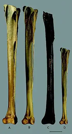 Buteogallus daggetti was first described by Loye Holmes Miller in 1915 as Morphnus daggetti, from a tarsometatarsus found in the La Brea Tar Pits.[2] The bone's great length, comparable to a great blue heron's, gave him the impression of an "eagle on stilts" and led to comparisons with the secretarybird. The specific name pays tribute to F.S. Daggett of the Natural History Museum of Los Angeles County (at the time the Museum of History, Science, and Art). By 1925, Miller had assigned three more tarsometatarsi and an incomplete tibiotarsus to the genus.[1]