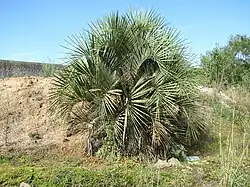 By at least 2009 an anonymous source considered this palm naturalised in Florida and it was included in the USDA PLANTS database.[16] In 2010 this opinion was validated when the first instance of a naturalised palm was published, recording a 2005 collection of a specimen in the dunes of the Chinsegut Wildlife and Environmental Area in Hernando Co.,[21] a former farm and estate with some plantings of Butia palms.[22][23] Another instance of this palm naturalising was recorded in literature (no voucher) in 2013 in Silver River State Park, Marion Co.[16] As of 2018, the Atlas of Florida Plants shows voucher specimens (identified as B. capitata (with a caveat)) have been collected in the central and northern counties of Hernando, Volusia, Washington, Liberty, Gadsden, Leon and Wakulla.[24]