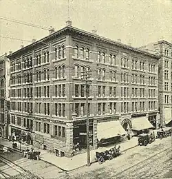 Building plans for the new Butler Block were announced July 3, 1889, in the Seattle Post-Intelligencer, less than a month after the fire. Designed by the short-lived partnership of Parkinson and Evers, it was built as an office building, the Phinney and Jones Building, for Guy C. Phinney and Daniel C. Jones.[2] The English-born John Parkinson of Parkinson and Evers had just arrived in Seattle from Napa, California, after the fire, and was for several years one of Seattle's leading architects, before moving to Los Angeles after the Panic of 1893.[2] Seattle neighborhood Phinney Ridge is named after Phinney, one of the city's leading businessmen of the era.[6] Jones, in contrast was a foulmouthed frontiersman who apparently carried a gun in each hip pocket.[2] The new hotel opened in 1894 under the management of two German immigrants, Dietrich Hamm and Ferdinand Schmitz. It included a large dining room which was managed by Mr. Hamm. It was divided into both men's and women's sections. Included also was a grill room featuring fresh seafood and shell fish. Hamm and Schmitz operated the hotel until 1903, at which time Edward Sweeney of the Seattle Malting and Beverage Company secured the lease, forcing the retirement of Hamm and Schmitz.§[7]