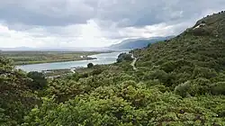Butrint is part of a diverse hydrographical network, composed by the courses of several rivers, lagoons and lakes. The rivers are short, steep and characterised by high water volume.[8] The park comprises Lake Butrint in the northwest, Lake Bufi in the southeast, Bistrica River in the north, Mile Mountain in the west and Pavllo River in the south.[9]
