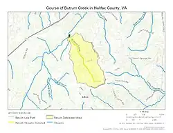 Butrum Creek rises about 1 mile west of Cedar Grove, Virginia, and then flows northeast and to join Lawsons Creek about 3 miles northeast of Alton.[1]