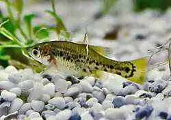 The butterfly splitfin or butterfly goodeid (Ameca splendens) is a bony fish from the monotypic genus Ameca[2] of the splitfin family (Goodeidae). It was formerly found throughout the Ameca River drainage in Mexico; the type locality is Rio Teuchitlán in the vicinity of Teuchitlán, Jalisco, near the town of Ameca. The species was historically only found in an area about 10 miles (15 km) in diameter[3] but in the early 21st century, searches have found it in a few other locations in the region, up to 100 km away at Cuyacapán.[1]