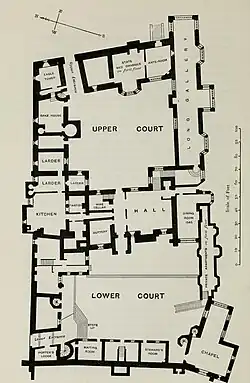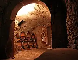 In a large house, the buttery's principal function was storage of wine and its preparation for serving. Candles were also dispensed from the buttery, as was beer, to those lower members of the household not entitled to drink wine.[1] Today in colleges in Cambridge, Dublin, and Oxford, drinks are served from the "Buttery Bar".[2] The buttery generally had a staircase to the beer cellar below.[3] The wine-storage area of the buttery, in keeping with the higher value of its contents, was often more richly decorated to reflect the higher status of its function.[4]