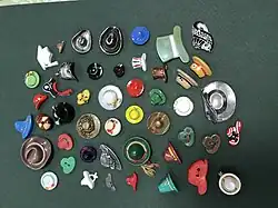 Buttons exist in a myriad of materials, including fabric and cloth, metal, glass, ceramic, enamel, natural materials such as wood, bone, or shell, a number of types of plastic, and more.[19][20]