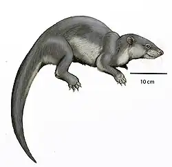 Buxolestes were otter-like freshwater fish predators with a body length reaching about 46 centimetres (18 in) and a tail about 35 centimetres (14 in) long. They were significantly smaller than most living species of otters. Fossilized stomach contents confirm their semiaquatic freshwater habits. The anatomy of these archaic "insectivorous" mammals is known through well-preserved Middle Eocene specimens found at Messel in Germany. Their structure evidences a clear adaptation to a semiaquatic way of life. The forelimbs and hindlimbs are powerful and show strong claws. The tail is clearly fit for swimming. The skull is long, with large molars that appear to be adapted to a diet of molluscs with shells (freshwater clams and freshwater snails), but the predilection postulated from the dentition has not been confirmed.