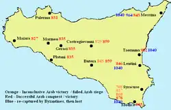 In 829, Michael II died and was succeeded by his son Theophilos. Theophilos received a mixed diet of success and defeat against his Arab opponents. In 830 AD the Arabs returned to Sicily and after a year-long siege took Palermo from their Christian opponents and for the next 200 years they were to remain there to complete their conquest, which was never short of Christian counters.[12] The Abbasids meanwhile launched an invasion of Anatolia in 830 AD. Al-Ma'mun triumphed and a number of Byzantine forts were lost. Theophilos did not relent and in 831 captured Tarsus from the Muslims.[13] Defeat followed victory, with two Byzantine defeats in Cappadocia followed by the destruction of Melitene, Samosata and Zapetra by vengeful Byzantine troops in 837. Al-Mu'tasim however gained the upper hand with his 838 victories at Dazimon, Ancyra and finally at Amorium[13]—the sack of the latter is presumed to have caused great grief for Theophilos and was one of the factors of his death in 842.