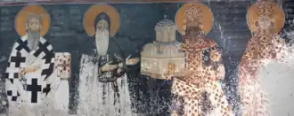 Serb kings, queens, nobility, monks and head of Serb Church wearing Byzantine dress. A fresco from the Serbian Orthodox Studenica Monastery.