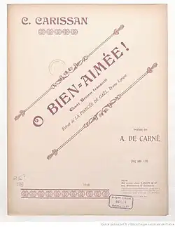 During a concert at the Société nationale de musique on 10 January 1891, two of Carissan's works, Écho and Chanson de l'abeille, were performed at the Salle Pleyel in Paris.[4] The same year, her La Fiancée de Gaël, based on a poem by Adrien de Carné with Breton influences, was performed in Nantes and Paris. Sonneur de Bretagne critic Sullian Collin praised the use of Breton themes and stated that Carissan had "made excellent use" of it.[3]