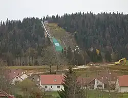 Ski jumping competitions have been held in Chaux-Neuve since the early 20th century.[5][6] The Ski Club du Risoux was established in 1909.[7] In 1965, the municipality of Chaux-Neuve initiated a project to construct an Olympic-sized ski jump, which was supported by a grant from the Directorate of Youth and Sports. However, difficulties encountered concerning earthworks and funding led to the project being terminated.[2][8][7] Two decades later, neighboring communes collaborated to construct the stadium, primarily in preparation for the 1990 Junior Nordic Ski World Championships.[9][2] The ski jump was constructed between 1989 and 1990 under the direction of architect Gérard Boucton,[2] at an approximate cost of 15 million francs.[10] The ski jump was inaugurated in January 1990; however, the Junior World Championships were relocated due to insufficient snow in Chaux-Neuve.[7] In December 1990, the stadium hosted a round of the World Cup B.[2] Since 1996, it has been the site of an annual Nordic Combined World Cup event.[2]