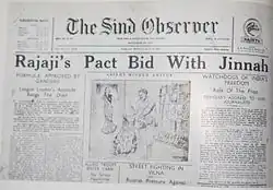 While the formula retained most of the essential services, Jinnah wanted a full partition and any relations would be dealt via treaty alone.[37] Although a failure the CR formula was seen as Congress' betrayal of the Sikhs by Akali Dal leaders like Master Tara Singh.[38] Since the formula meant vivisection of Punjab, if agreed the Sikh community would be divided. Sikhs did not hold a majority in any single district. Splitting Punjab would leave many on both sides of the dividing line.[29] The proposal had been attacked by other leaders such as V. D. Sarvarkar[39] and Syama Prasad Mookerjee of the Hindu Mahasabha and Srinivas Sastri of National Liberal Federation.[30] However, Wavell the then viceroy of India who had earlier insisted on the geographic unity of India,[32] stated that the talks based on the CR formula failed because Gandhi himself did "not really believe" in the proposal nor Jinnah was ready to "answer awkward questions" which would reveal that he had "not thought out the implications of Pakistan".[37]