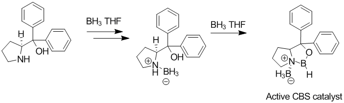 The CBS catalyst can be prepared from diphenylprolinol,[1] condensed with a phenylboronic acid, or with borane (as shown below). The CBS catalyst then complexes in situ with borane to give the active catalyst.[2]