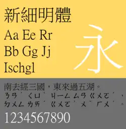| PMingLiU | 新細明體 | TC (Taiwan) | Microsoft Windows 95+ | Distributed with Traditional Chinese version of Windows 95, all regional versions of Windows 2000 to Windows 8.1, and the Traditional Chinese version of Windows 10. The Latin characters in this font is proportional. | ||