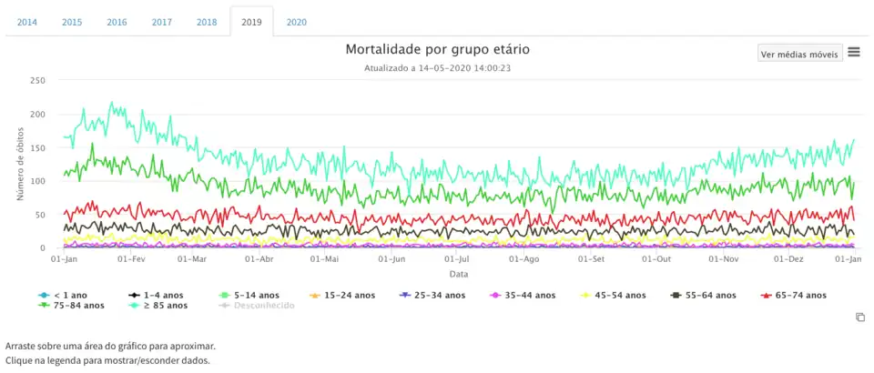In the following two graphs, the total deaths per day and by age group are presented for the years 2019 and 2020.[78]