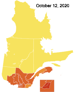 On September 8, 2020, the province unveiled a four-tier, colour-coded system of regional health restrictions based on caseload and healthcare capacity. Tiers ranged from green to red, with each tier imposing progressively more severe restrictions than the last. Initially, only the most populated areas of Montreal and Quebec City were in the red zone. However, by the time the winter wave hit its peak a few months later, all 18 regions of the province were either in the orange zone or the red zone. Over the remainder of the winter and the spring, Quebec slowly downgraded the alert level in each region. By June 28, 2021, all regions had entered the green zone, bringing an end to the regional alert system.