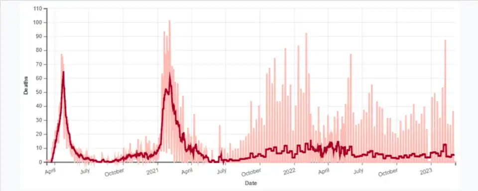 Daily new deaths with 7-day moving average (to 6 March 2023)